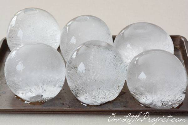 Odată umplute cu apă, așează baloanele pe o foaie de copt în congelator. După înghețare, îndepărtează baloanele cu ajutorul unui cutter sau a unei foarfeci, astfel încât să rămână doar apa înghețată și globurile sunt gata.