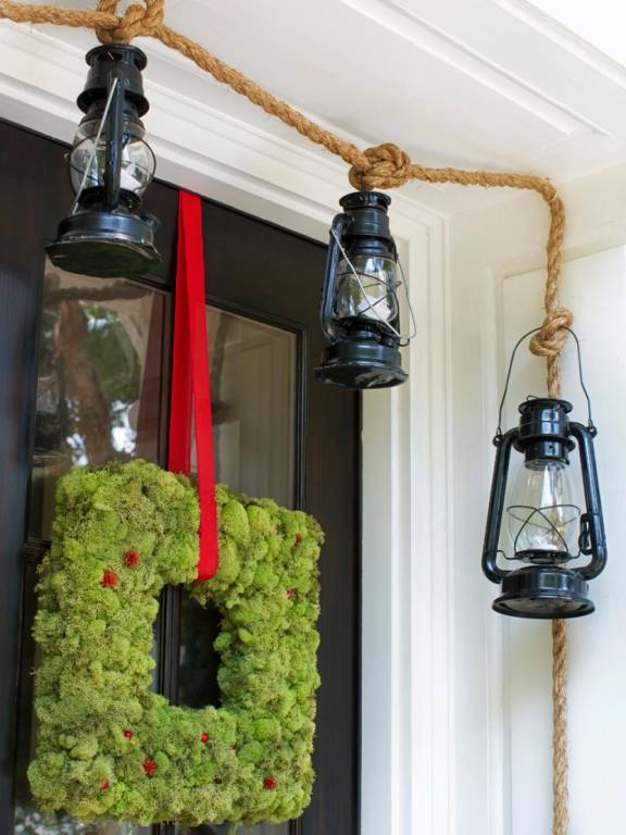 Ca să amintești de atmosfera Polului Nord pe o sfoară agață simetric felinare. Această ghirlandă originală ar trebui să-ți încadreze tocul ușii de la intrare, pe lângă tradiționala coroniță, pe care de asemenea am împrumutat-o de la americani.