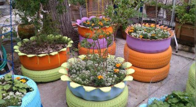 2-3 cauciucuri uzate pot fi așezate unul peste altul, vopsite în culori diferite, chiar personalizate cu flori și chipuri zâmbitoare (îți trebuie ceva îndemânare în această situație) și transformate într-un ghiveci uriaș, un suport pentru arbuști sau un buchet generos de flori, plantate unele lângă celelalte.