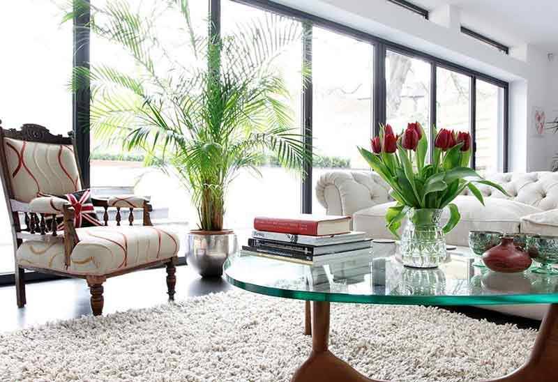 În living sunt potrivite plantele de cameră de dimensiuni mari. Acestea trebuie să stea jos, pe podea, cât mai aproape de sursa de lumină naturală. Totuși, înainte de a cumpăra o plantă pentru living, asigură-te că ea nu va crește mai mult decât va  permite camera.