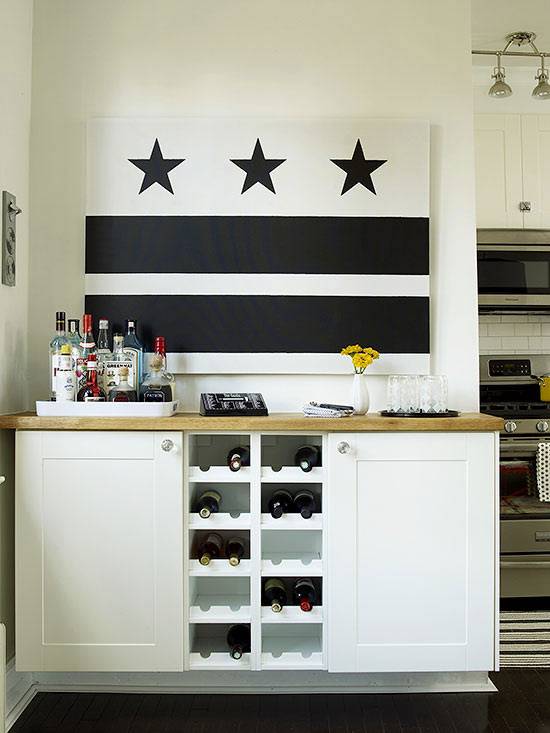 Blaturile pentru chiuvete și pentru gătit au fost achiziționate la prețuri accesibile iar pereții erau îmbrăcați cu plăci allbe. Un suport de depozitare pe perete a transformat un perete gol într-un spațiu organizațional important. Dulapurile albe păstrează pasul cu originile vintage ale apartamentului, la fel ca și trapele și cârligele. O bară se potrivește perfect pe peretele mic care împarte camera de zi și bucătăria, funcția de ambalare în spațiu neutilizat, o necesitate într-un apartament mic. Proprietarii casei au pus două blaturi superioare deasupra podelei și au adăugat două rafturi pentru vinuri între ele. După care au folosit același blat ca și la bucătărie.