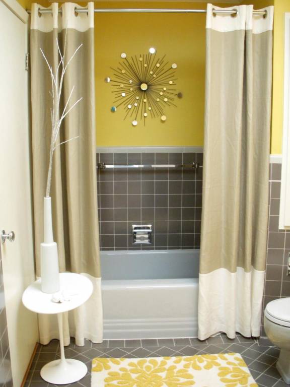 Dacă nu poți schimba finisajele băii tale, gresia sau faianță, nu-i nimic, poți să-i schimbi aspectul apelând la accesorii în contrast cu acestea. Perdeaua de duș, covorașul de baie, lavabila din zonele neacoperite de faianță sunt modalități accesibile de a-ți transforma baia. În cazul de față, griul plăcilor ceramice devine mul mai atrăgător prin infuzia de galben.