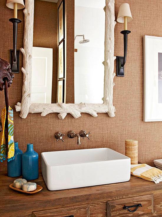 - Designerul acestei băi s-a inspirat din atmosfera de la plajă și a transformat o baie de mici dimensiuni într-una deosebit de atractivă. Detaliile amintesc de textura nisipului, a stâncilor și scoicilor regăsite pe malul mării. De asemenea, culorile sunt în ton cu atmosfera creată. Suportul de prosop și lămpile de lângă oglindă conferă încăperii un aspect rustic.