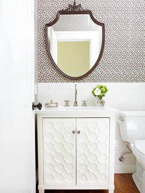 8. Baia din imagine este un bun exemplu că și băile mici pot fi de-a dreptul spectaculoase. Tapetul cu model mărunt și modelul ușilor de la dulap au forme jucăușe. Oglinda elegantă cu ramă de lemn aduce un plus de eleganță.