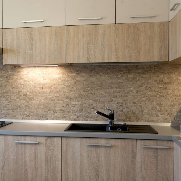 Modele de bucatarii mici se confrunta cu problema spatiului, acesta trebuind sa indeplineasca o dubla functie: estetica si practica. Fireste, pe primul plan se afla utilitatea, urmata indeaproape de frumusete, insa piatra naturala poate sa confere, printr-o cantitate destul de mica, o atmosfera calda si relaxanta. O pardoseala placata cu travertin Silver Cross Cut se poate asorta cu un blat si glafuri de granit gri; un blat din marmura Sunny Dream Polisata vine bine cu un contrablat din mozaic realizat din travertin Latte Cross Cut antichizat si travertin Classic (10 x 10) sau din paneluri din ardezie Multicolora; un blat de marmura Thassos se incadreaza excelent cu un contrablat din placi terazzo… Ardezia flexibila SKIN, material nou intrat pe piata romaneasca, se poate utiliza la placarea mobilierului de bucatarie, lucru care determina o infrumusetare neasteptata, radicala si rapida, chiar si pentru dulapurile mai vechi: ardezia flexibila este foarte maleabila, usoara, rezistenta si impermeabila.