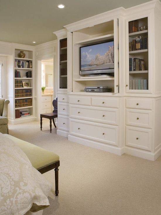 ”Ascunde-l”  într-un dulap. Într-un dormitor, televizorul ar trebui să fie o piesă cât mai discretă cu putință. De aceea, designerii recomandă să-l ”ascunzi” într-un dulap. Fie în cel de haine dacă este în dormitor, fie într-unul de dimensiuni mai reduse, și care este plasat pe un perete, astfel încât să-l vezi din pat. În cazul în care nu găsești piesa perfectă, ia în considerare angajarea unui tâmplar pentru a construi ceva care se potrivește perfect proporțiilor televizorului.