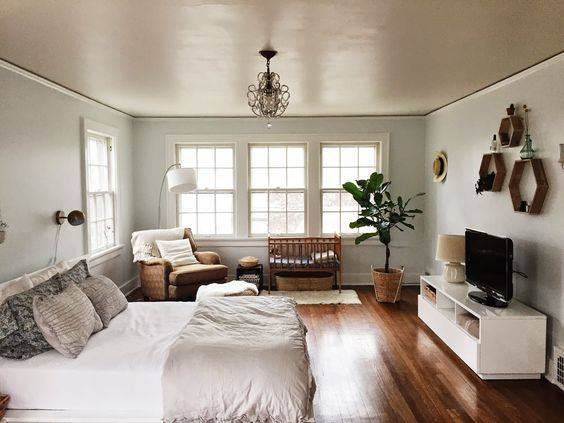 Suspendă-l pe un perete. Fie îl prinzi de grinda din fața patului, fie îl pui în colțul opus patului. Sunt variantele cele apreciate de către cei care au un televizor în dormitor. Această modalitate de integrare nu-ți încarcă spațiul și nici nu ai nevoie de foarte multe obiecte. Cu alte cuvinte, nu este nici costisitor.