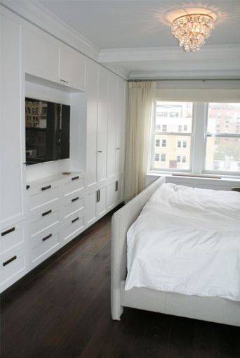 ”Ascunde-l”  într-un dulap. Într-un dormitor, televizorul ar trebui să fie o piesă cât mai discretă cu putință. De aceea, designerii recomandă să-l ”ascunzi” într-un dulap. Fie în cel de haine dacă este în dormitor, fie într-unul de dimensiuni mai reduse, și care este plasat pe un perete, astfel încât să-l vezi din pat. În cazul în care nu găsești piesa perfectă, ia în considerare angajarea unui tâmplar pentru a construi ceva care se potrivește perfect proporțiilor televizorului.