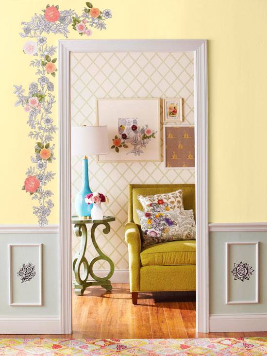 O idee inedită, dar de mare efect ar fi și o pictură murală. Dacă ai talent la desen, atunci renunță la ideea de a mai agăța ceva pe pereți, mai bine ia o pensulă și pictează, dă frâu imaginației. Așa îți vei manifesta și talentul artistic. Cel mai ușor de realizat sunt modelele florale sau formele geometrice. Poți folosi culori diferite, de exemplu  combinția de negru și gri sau cea de verde și albastru sunt o alegere bună. De asemenea, poți picta într-o singură nuanță. Poate fi vorba de o culoare vibrantă, care să dea farmec și strălucire camerei. Cei care-ți vor trece pragul casei vor fi, cu siguranță impresionați de creația ta.