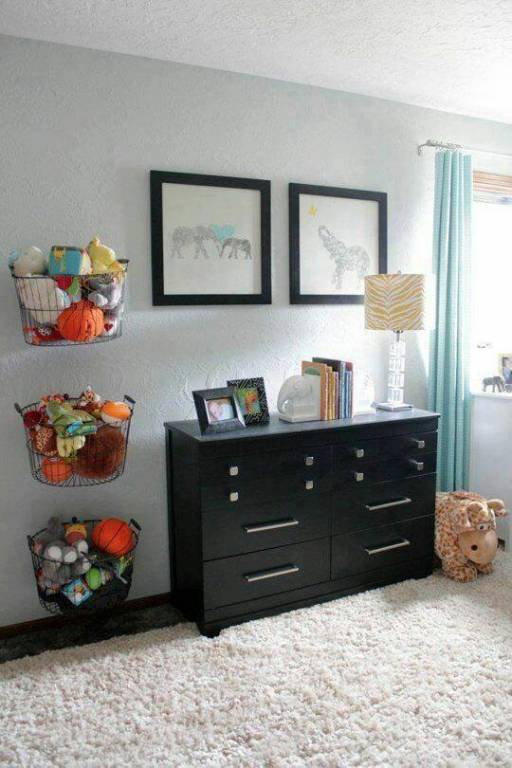 Folosește spațiul de pe perete. Agață cârlige pe pereții nefolosiți, în care poți prinde saci plini cu jucării.