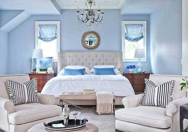 În ciuda faptului că albastrul este o culoare rece, care are drept efect vizual îndepărtarea obiectelor și crearea iluziei unui spațiu mai mic decât este în realitate, albastrul este considerat una dintre cele mai potrivite culori pentru dormitor.