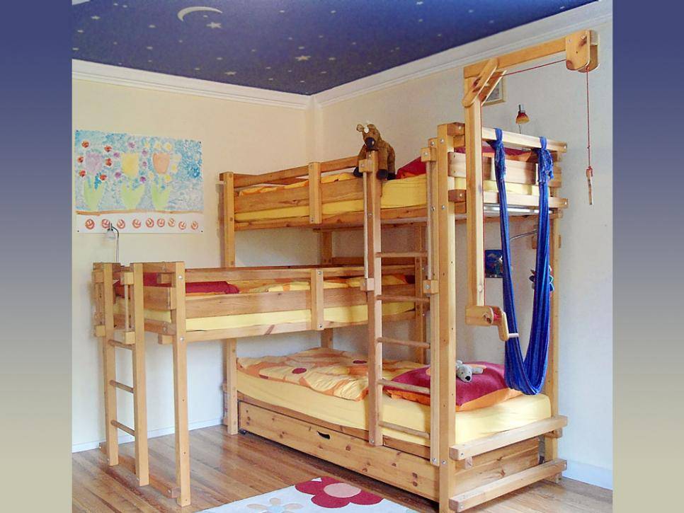 O soluție foarte utilă în camera copiilor este achiziționarea unui pat supraetajat. Soluția poate fi aplicată și în cazul în care este vorba de trei paturi, rezultatul fiind un model de pat particular și inovativ.