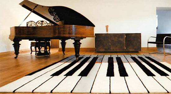 7. Iubești muzica clasică și în special pianul? Optează pentru un covor precum cel din acestă imagine. Pe lângă faptul că modelul subliniază pasiunea pentru artă, combinația alb-negru crează un contrast plăcut.