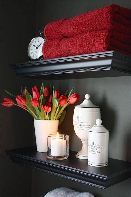 De asemenea, poți alege să plasezi coșuri sau cutii de culoare roșie pe rafturile din baie sau chiar pe marginea chiuvetei. Ca să nu mai zicem de un buchet de flori roșii, de genul lalelelor sau al trandafirilor. Acestea îi dau băii un aspect romantic, elegant și feminin.