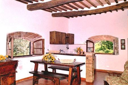 Mobilierul este unul robust din lemn, cu înălțimi care nu variază foarte mult, decorat cu piese mici din fier, funcționale sau cu rol decorativ. Mobilierul are întotdeauna patină, la fel ca și zugrăvelile. Într-o astfel de casă nu vei întâlni perfecțiuni la nivel de finisaje, totul fiind făcut manual și cu aspect deliberat antichizat. Grinzile din lemn sunt vizibile și de obicei lucrate dintr-o esență de lemn dur, creând astfel un aspect rustic. Tâmplăria este colorată în nuanțe întunecate, încât să poată conferi personalitate întregului spațiu. În casele tradiționale toscane zidăria este adesea expusă la vedere, detaliu care nu face decât să accentueze și mai mult aspectul rustic și nefinisat.