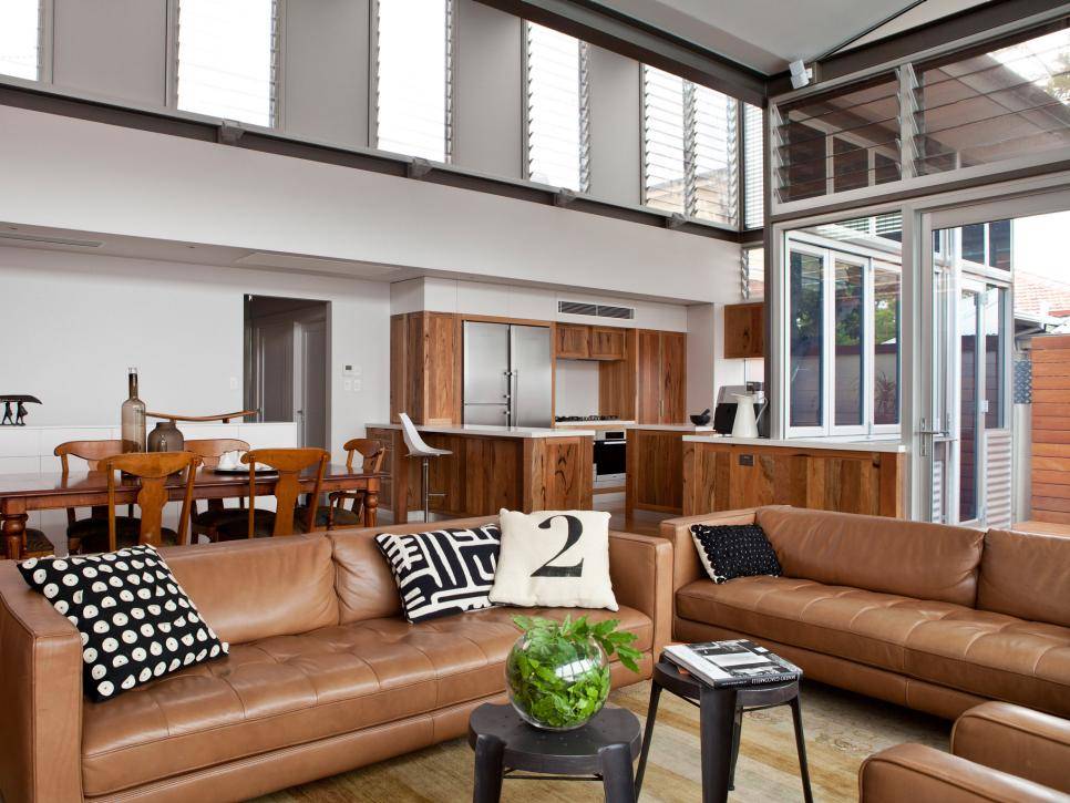 Soluție creativă. Într-o casă nouă, designerul Jodie Cooper a preluat conceptul de iluminare dramatică la noi înălțimi, folosind un “perete etanș” realizat la comandă suspendat din tavan de cromate pentru a lumina bucătăria și zona de luat masa. De asemenea, peretele de compartimentare vă ajută să definiți vizual zona de bucătărie fără a pierde simțul stilului loft”, spune designerul. Și, remarcă ea, “nu avem nevoie de o bucătărie modernă pentru a avea un decor modern. Prin amestecarea unor piese, cum ar fi scaune retro, lucruri antice chinezești și o masă rustică, combinată cu covoare turcești, am creat texturi și straturi, care adaugă un stil Boemian casei pentru a crea ceea ce eu numesc un interior “Global Eclectic”.