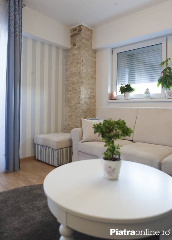 Daniela, proprietara apartamentului cu living-ul placat parțial cu travertin, care s-a ocupat singură de deciziile și conceptul spațiului, detaliază: “M-a atras stilul romantic, cu preponderență de alb, cu accente de Provence, dar și englezești. Camera este foarte luminoasă și am dorit să creez un echilibru între lumină și o culoare mai rece. Astfel, am adăugat nuanțe de albastru și turcoaz”.