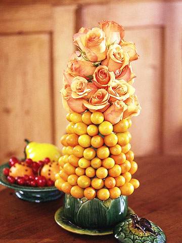 Dacă îți dorești ceva mai special pentru masa de Crăciun sau Revelion, optează pentru un aranjament exotic cu trandafiri și kumquat. Aceste fructe sunt asemănătoare cu portocalele, însă au dimensiuni mai mici și se deosebesc prin faptul că se consumă cu tot cu coajă. Ele pot fi găsite și la noi în comerț și cu siguranță te vor ajuta să-ți impresionezi musafirii. Aranjamentul este simplu de realizat. Vei avea nevoie de un suport de spumă, bete pentru frigărui, trandafiri și fructe kuamquat. Înfige fructele și florile în bețele de frigărui, iar capătul celălalt al bețelor, în suportul de spumă. Poți crea diferite forme, după bunul plac.