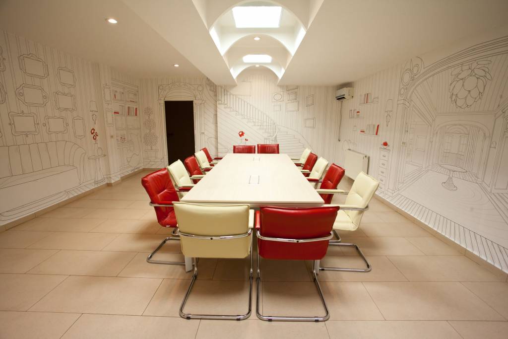Un alt exemplu reprezentativ în amenajarea de office design îl constituie sălile de întâlniri, care are au un design deosebit: pereții sunt îmbrăci într-un tapet special, printat cu un vizual creat special pentru pentru noi de către Matei Apostolescu, un artist digital apreciat. De fapt, imaginea ce personalizează tapetul, ce-i oferă individualitate a fost conceput de noi în colaborare cu cu Matei și ilustrează un interior al unei case generoase, un interior cald, primitor și include la nivel grafic elemente care se regăsesc și în realitate în sală: rame pentru diplomele primite în urma participărilor la competiții de comunicare, uși și altele. Nu au ales o imagine colorata, pentru că ar fi încărcat foarte mult spațiul, combinația de alb-negru li s-a părut mult mai originală, au fost inserate totuși câteva accente de roșu. De altfel, multe dintre tablourile și elemente personalizate din sediu au fost asigurate de cei de la Beaucoupzero: Matei Apostolescu – ilustrator și artist vizual și Silvana Bratu – costume designer, fotograf și curator, prietenii noștri dragi, gata oricând să vină în ajutor cu niște idei trăsnite, dar de impact, memorabile.