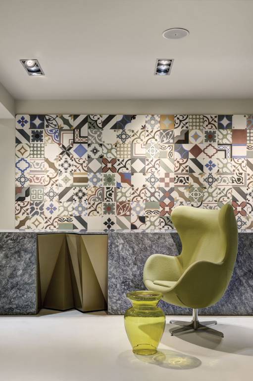 Zona colonială, cu canapele și șemineu, este de asemenea un spațiu de prezentare, însă, totodată, este și un spațiu funcțional, destinat clienților care așteaptă încărcarea materialelor. Acesta, reușește foarte simplu să te convingă de eleganța și modernitatea pietrei naturale, mai ales dacă o asociezi cu piesele potrivite, precum un corp de iluminat ce amintește de rigiditatea matematică, de formele geometrice, de un stil industrial în tendințe.