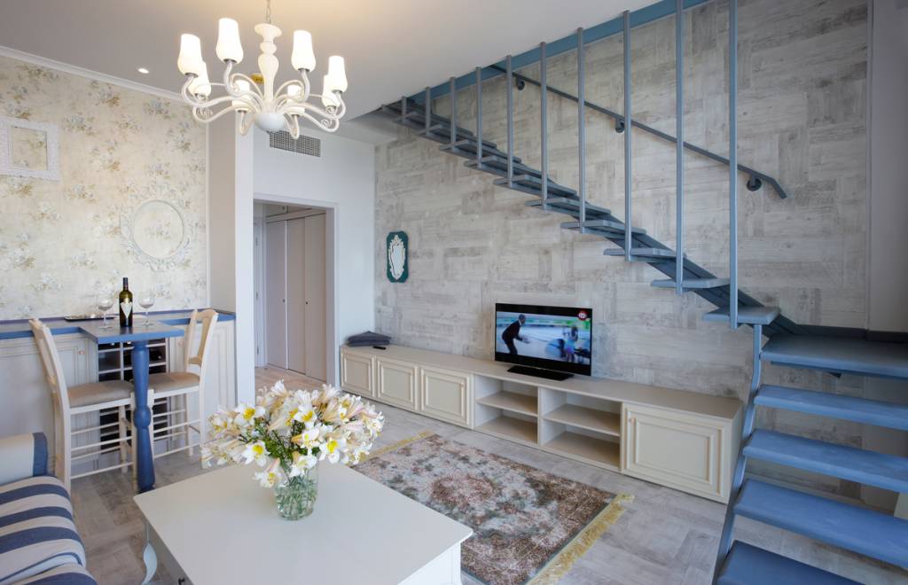 Mobilierul ales cu atenție pentru a se potrivi dimensiunilor spațiului este excelent. Alegerea unui scaun care poate fi și o măsuță e destul de ingenioasă și fiți siguri că nu este singura idee inedită din cadrul acestei amenajări.