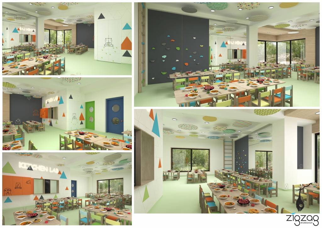 Sala de mese comunică cu mediul înconjurător prin niște ferestre mari, care asigură o priveliște minunată pentru cei mici în timpul mesei. Copiii pot astfel observa cum își lasă amprenta fiecare anotimp peste copacii din pădure. În anotimpul rece, atunci când vremea nu permite realizarea activităților în mijlocul pădurii, în aer liber, sala de mese devine sală de sport, fiind echipată cu panouri de cățărare și alte zone de distracție.