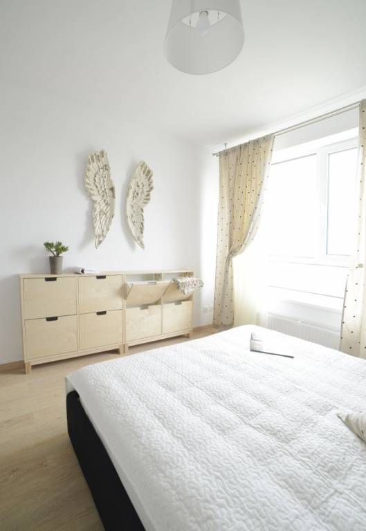 Revenind la cei 53 mp luminoși, aceștia sunt cât se poate de aerisiți, Irina recurgând la puține piese de mobilier într-un cadru alb. Astfel, se menține senzația de spațiu, de lejeritate, în timp ce lumina inundă cu dărnicie atât livingul open space, cât și dormitorul (iar acesta este cel de-al doilea motiv pentru care m-am oprit la acestă amenajare).