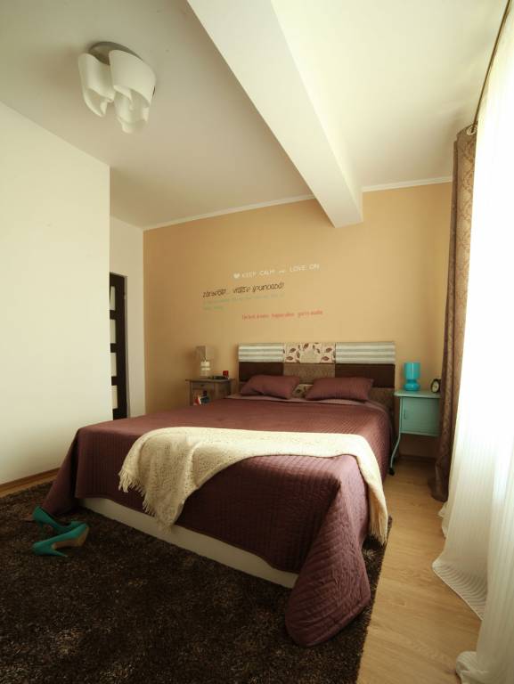 În dormitor, piesa de rezistență este indubitabil patul cu tăblia tapițată, care a luat naștere de la ideea de patchwork. S-au folosit mai multe tipuri de textile, păstrând drept model același material pentru care s-a optat și în cazul draperiilor. S-a obținut astfel o continuitate, fără să se piardă legătura dintre elementele ce definesc spațiul. Finisajul mobilierului din dormitor este deschis la culoare, doar dressingul are aplicate pe fața ușii niște fâșii din sticlă de culoare cappuccino, pentru a crea vizual o compoziție geometrică.