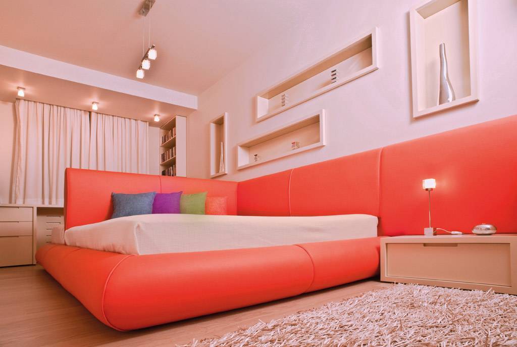 Patul din piele orange care se găsește în dormitor, a fost gândit de Oana și Lucian astfel încât, optic, să pară un singur obiect, dar în realitate, prin ancorarea unui paravan în structura patului, să permită odihna separată a celor două beneficiare. De asemenea, s-a ținut cont în designul patului de posibilitatea ca la majoratul fetei, apartamentul să îi aparțină integral și odihna ei să se desfășoare în partea de pat matrimonial. În consecință, acea parte care îi revine atât timp cât locuiește cu mama, a fost concepută într-un mod în care ulterior să se transforme prin folosirea paravanului ca spătar, într-o canapea aferentă zonei de birou.