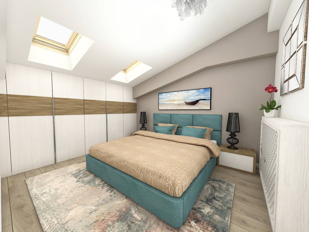 Nici dormitorul matrimonial nu este de omis, cu toate că este destul de simplist amenajat, el este caracterizat de bun gust și rafinament. În fond, eleganța se remarcă prin simplitate, iar pentru a sublinia acest lucru patul king size a fost tapițat cu o catifea plăcută la atingere, în aceeași nuanță de turcoaz pe care o regăsim și în living. Clar, aici avem de-a face cu teritoriul oamenilor mari unde culorile sunt mai domolite, iar dressingul se impune prin dimensiuni impresionante.