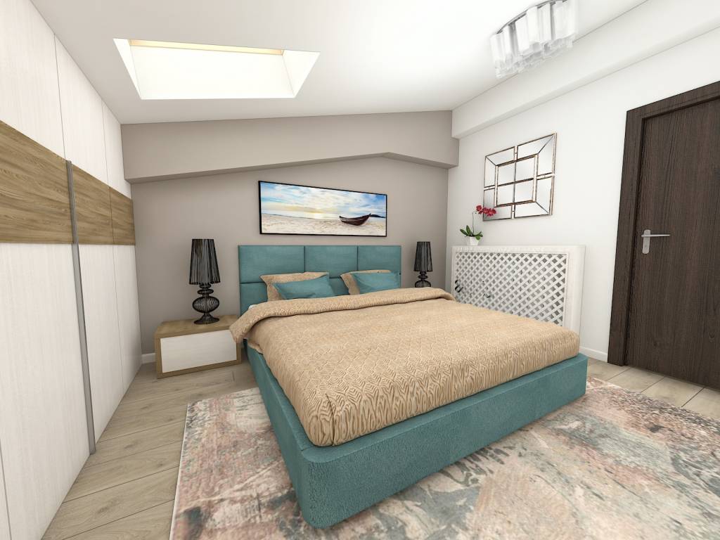 Nici dormitorul matrimonial nu este de omis, cu toate că este destul de simplist amenajat, el este caracterizat de bun gust și rafinament. În fond, eleganța se remarcă prin simplitate, iar pentru a sublinia acest lucru patul king size a fost tapițat cu o catifea plăcută la atingere, în aceeași nuanță de turcoaz pe care o regăsim și în living. Clar, aici avem de-a face cu teritoriul oamenilor mari unde culorile sunt mai domolite, iar dressingul se impune prin dimensiuni impresionante.