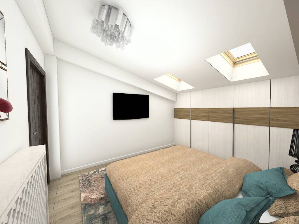 Nici dormitorul matrimonial nu este de omis, cu toate că este destul de simplist amenajat, el este caracterizat de bun gust și rafinament. În fond, eleganța se remarcă prin simplitate, iar pentru a sublinia acest lucru patul king size a fost tapițat cu o catifea plăcută la atingere, în aceeași nuanță de turcoaz pe care o regăsim și în living. Clar, aici avem de-a face cu teritoriul oamenilor mari unde culorile sunt mai domolite, iar dressingul se impune prin dimensiuni impresionante.