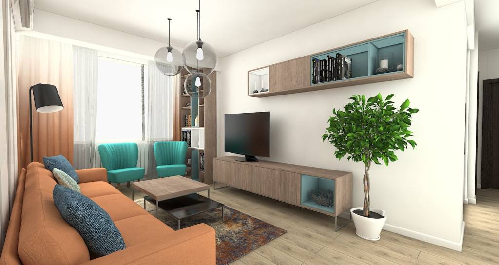 Avansăm în turul nostru virtual și facem un popas în living, o continuare a holului și o trecere spre zona de noapte. Aici, spațiul micuț și intim, se remarcă prin contrastul turcoaz-portocaliu și prin liniile destul de minimaliste ale pieselor de mobilier.