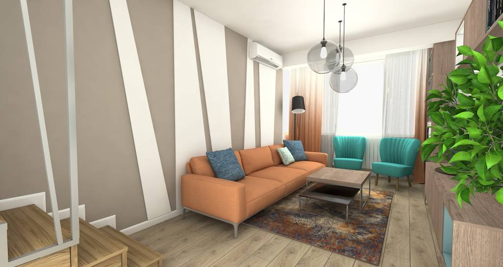 Avansăm în turul nostru virtual și facem un popas în living, o continuare a holului și o trecere spre zona de noapte. Aici, spațiul micuț și intim, se remarcă prin contrastul turcoaz-portocaliu și prin liniile destul de minimaliste ale pieselor de mobilier.