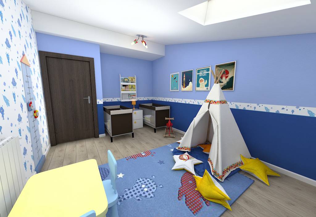 La etaj, cele care se remarcă dintr-o singură privire sunt camera copiilor, cu cort și nave spațiale, precum și camera cu rol multifuncțional (bibliotecă, spațiu de joacă, posibilă sală de mișcare, când cei mici vor mai crește, birou sau cameră de relaxare pentru cei care o vor căuta la un moment dat).