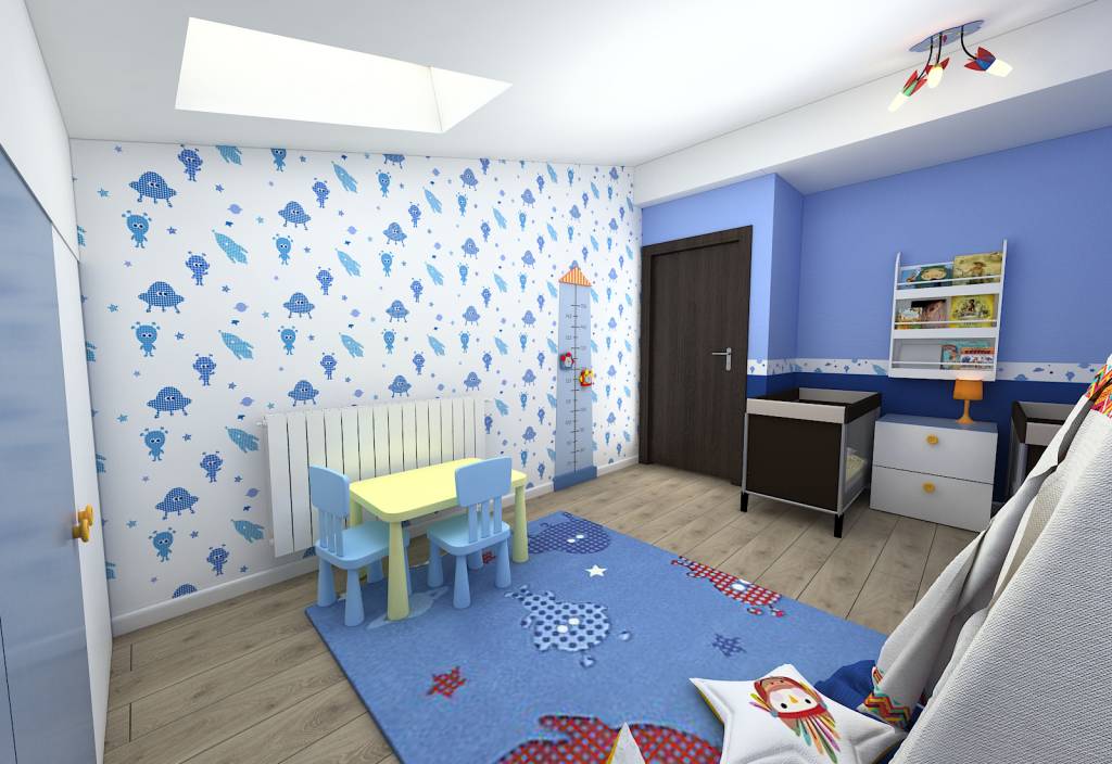 La etaj, cele care se remarcă dintr-o singură privire sunt camera copiilor, cu cort și nave spațiale, precum și camera cu rol multifuncțional (bibliotecă, spațiu de joacă, posibilă sală de mișcare, când cei mici vor mai crește, birou sau cameră de relaxare pentru cei care o vor căuta la un moment dat).