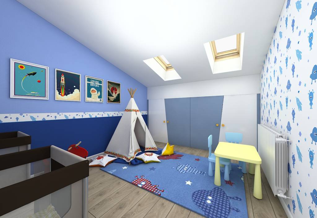 La etaj, cele care se remarcă dintr-o singură privire sunt camera copiilor, cu cort și nave spațiale, precum și camera cu rol multifuncțional (bibliotecă, spațiu de joacă, posibilă sală de mișcare, când cei mici vor mai crește, birou sau cameră de relaxare pentru cei care o vor căuta la un moment dat).
