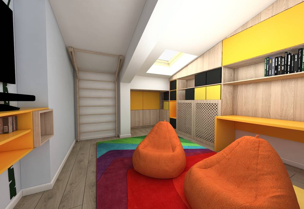 La etaj, cele care se remarcă dintr-o singură privire sunt camera copiilor, cu cort și nave spațiale, precum și camera cu rol multifuncțional (bibliotecă, spațiu de joacă, posibilă sală de mișcare, când cei mici vor mai crește, birou sau cameră de relaxare pentru cei care o vor căuta la un moment dat).