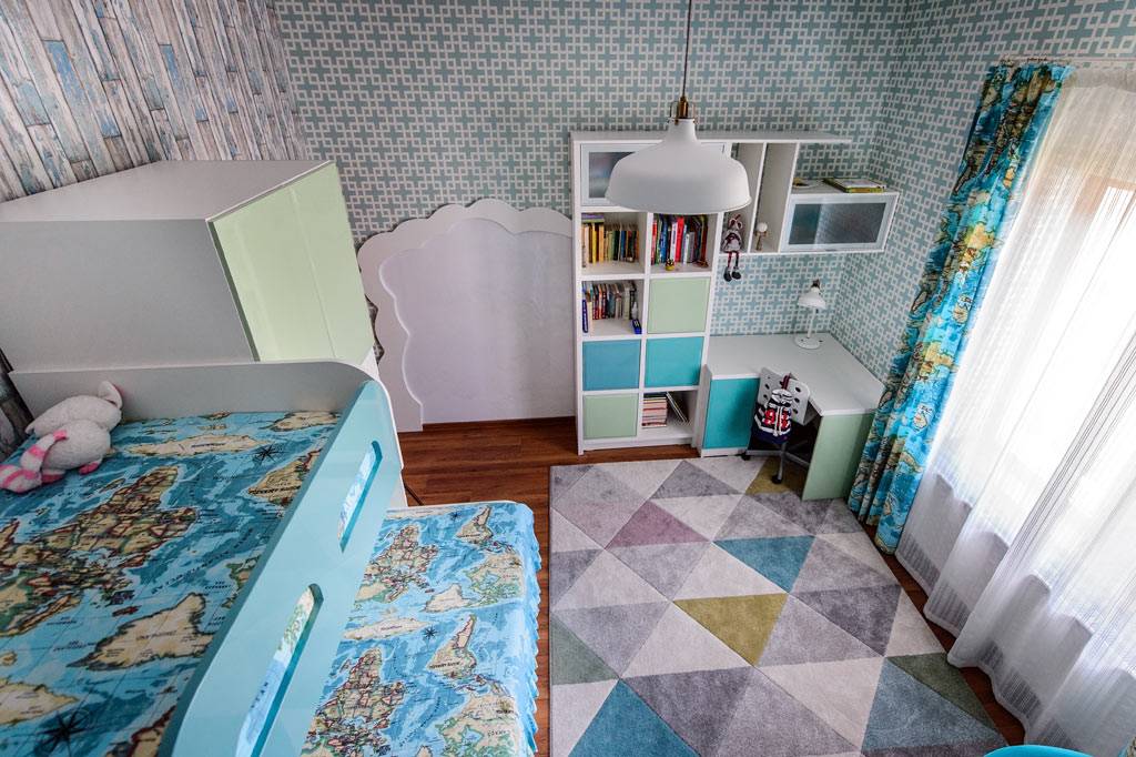 În ceea ce privește camera copilului, o domnișoară de 11 ani, a trebuit să îmbine funcțiunea de studiu cu cea de odihnă. Cerințele fetiței au fost dintre cele mai simpatice: să aibă o tablă de scris și un pat suplimentar pentru prietenele care vin în vizită. Astfel, s-a născut o amenajare în culori pastelate, care să rămână la fel de actuale și în anii adolescenței. Silvia a optat pentru separarea clară a spațiului de loisir de cel dedicat studiului, integrând în această zonă un birou dotat cu mai multe compartimente și o mică bibliotecă atașată. Structura patului, care conține și un mini-dressing walk-in, a fost o adevărată provocare, la fel și dulapul cu uși fațetate, montate pe un mecanism culisant. Un rol important în această cameră l-au jucat cuvertura și draperiile textile cu un imprimeu format din hărți – mereu ceva interesant de văzut și de întipărit în minte.
