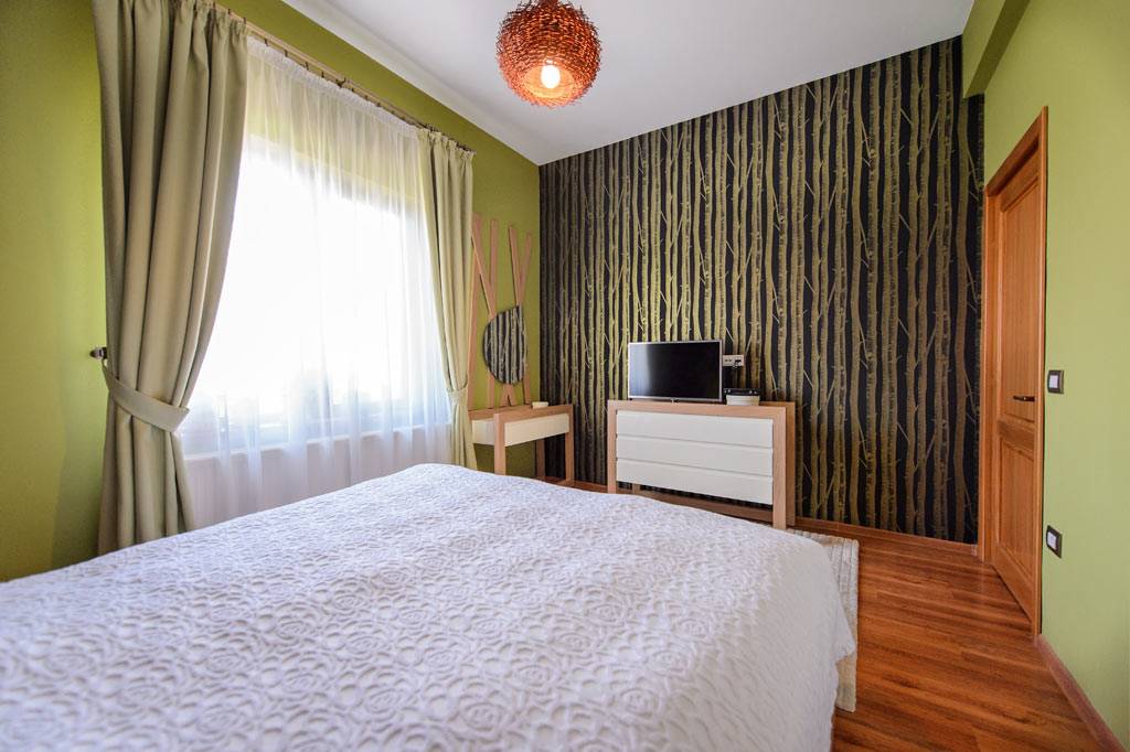 Dormitorul matrimonial cu două mici, dar încăpătoare zone de dressing atașate, a fost tratat într-o manieră ușor diferită. Fiind un spațiu privat, aici s-a avansat mai mult pe componenta de relaxare, fără stimuli vizuali extremi. Cele două tipuri de tapet au un aspect natural, iar din tavan coboară un corp de iluminat în formă de cuib. De asemenea, mobilierul din MDF vopsit și PAL cu furnir din lemn natural prezintă elemente vegetale stilizate. Zona din spatele patului beneficiază de o lumină ambientală indirectă, ce se poate utiliza și ca lumină de veghe.