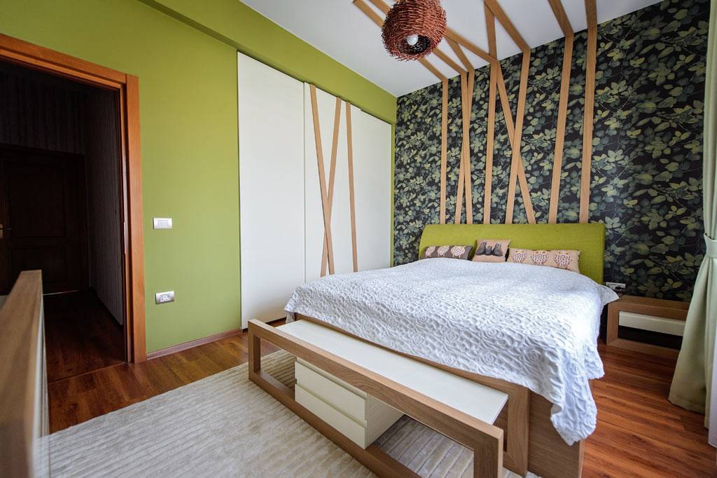 Dormitorul matrimonial cu două mici, dar încăpătoare zone de dressing atașate, a fost tratat într-o manieră ușor diferită. Fiind un spațiu privat, aici s-a avansat mai mult pe componenta de relaxare, fără stimuli vizuali extremi. Cele două tipuri de tapet au un aspect natural, iar din tavan coboară un corp de iluminat în formă de cuib. De asemenea, mobilierul din MDF vopsit și PAL cu furnir din lemn natural prezintă elemente vegetale stilizate. Zona din spatele patului beneficiază de o lumină ambientală indirectă, ce se poate utiliza și ca lumină de veghe.