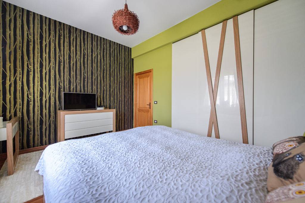 Dormitorul matrimonial cu două mici, dar încăpătoare zone de dressing atașate, a fost tratat într-o manieră ușor diferită. Fiind un spațiu privat, aici s-a avansat mai mult pe componenta de relaxare, fără stimuli vizuali extremi. Cele două tipuri de tapet au un aspect natural, iar din tavan coboară un corp de iluminat în formă de cuib. De asemenea, mobilierul din MDF vopsit și PAL cu furnir din lemn natural prezintă elemente vegetale stilizate. Zona din spatele patului beneficiază de o lumină ambientală indirectă, ce se poate utiliza și ca lumină de veghe.