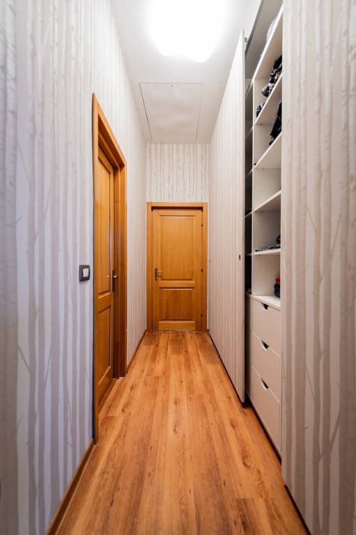 Pentru a crea un caracter cât mai unitar, dulapurile din hol au fost acoperite cu același tapet ca și cel de pe pereți, creându-se astfel o frumoasă simetrie.