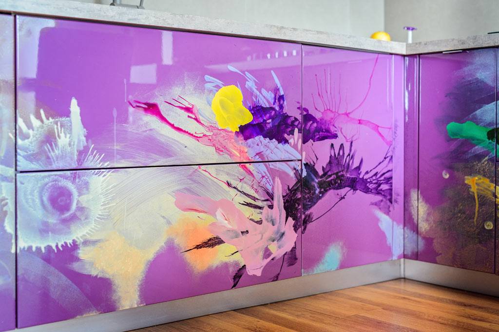 La nivel de interpretare cromatică, se poate vorbi despre o explozie de culoare atât la propriu, cât și la figurat. În atelierul producătorului, mobilierul a fost practic pictat pe MDF, folosind culori care se regăsesc și în celelalte zone ale amenajării sau culori complementare: violet-galben, verde-roșu. Compoziția a fost lucrată la „mână liberă”, folosindu-se de efectele generate de culori și de transparențele acestora. Rezultatul a fost original și pe placul beneficiarilor, care consideră acest spațiu ca fiind locul preferat din casă.