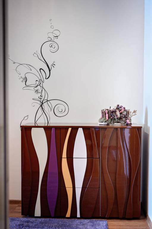 La nivel de interpretare cromatică, se poate vorbi despre o explozie de culoare atât la propriu, cât și la figurat. În atelierul producătorului, mobilierul a fost practic pictat pe MDF, folosind culori care se regăsesc și în celelalte zone ale amenajării sau culori complementare: violet-galben, verde-roșu. Compoziția a fost lucrată la „mână liberă”, folosindu-se de efectele generate de culori și de transparențele acestora. Rezultatul a fost original și pe placul beneficiarilor, care consideră acest spațiu ca fiind locul preferat din casă.