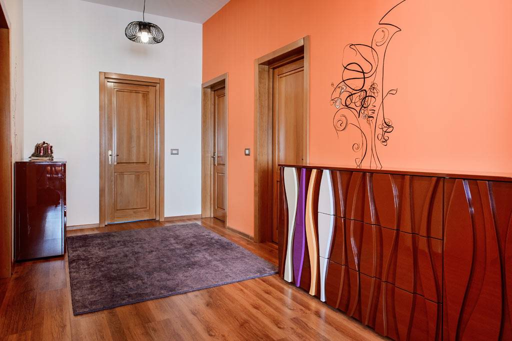 Pentru a crea un caracter cât mai unitar, dulapurile din hol au fost acoperite cu același tapet ca și cel de pe pereți, creându-se astfel o frumoasă simetrie.