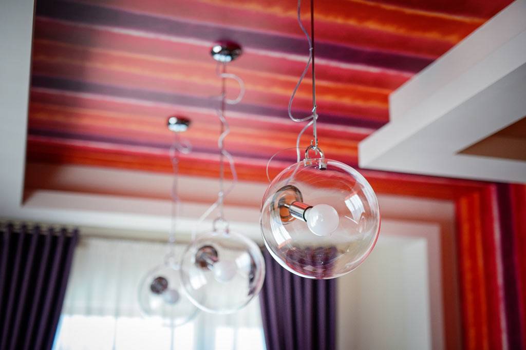 Elementul central al livingului este profilatura din gips-carton, iluminată indirect și acoperită pe două planuri cu tapet. Dungile verticale de pe pereți în culori puternice și amplasate pe zone restrânse măresc optic înălțimea printr-o „ruptură” de planuri și se constituie într-o piesă de rezistență vizuală a camerei.