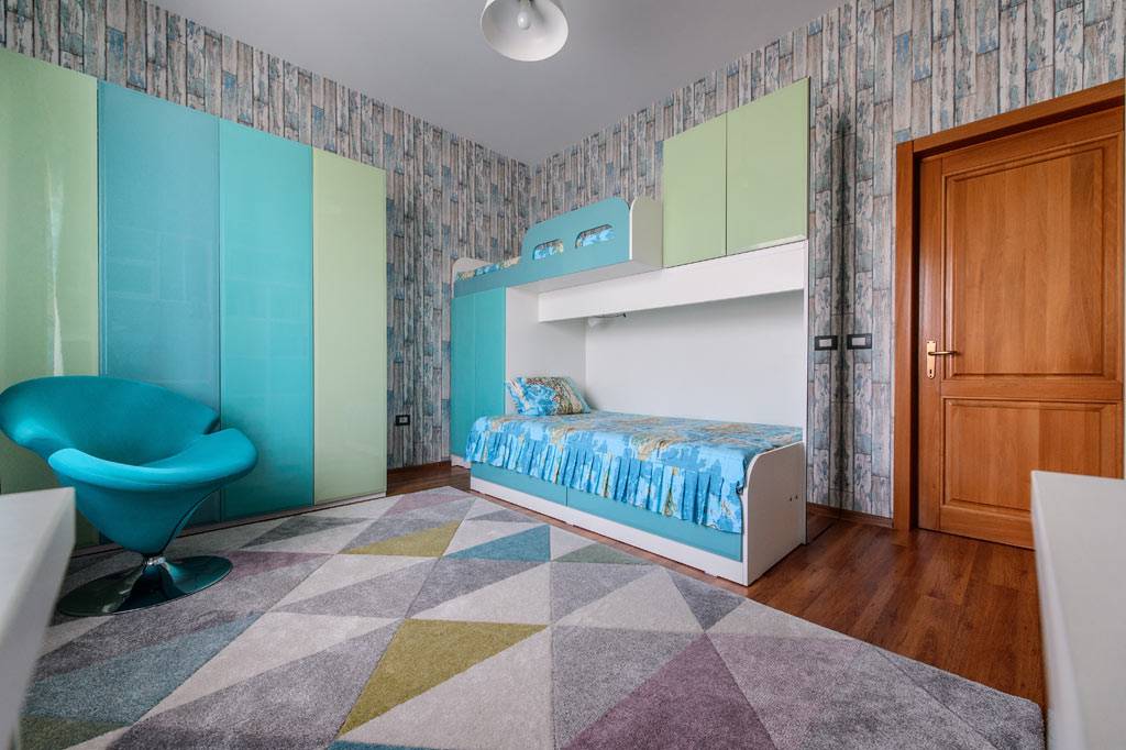 În ceea ce privește camera copilului, o domnișoară de 11 ani, a trebuit să îmbine funcțiunea de studiu cu cea de odihnă. Cerințele fetiței au fost dintre cele mai simpatice: să aibă o tablă de scris și un pat suplimentar pentru prietenele care vin în vizită. Astfel, s-a născut o amenajare în culori pastelate, care să rămână la fel de actuale și în anii adolescenței. Silvia a optat pentru separarea clară a spațiului de loisir de cel dedicat studiului, integrând în această zonă un birou dotat cu mai multe compartimente și o mică bibliotecă atașată. Structura patului, care conține și un mini-dressing walk-in, a fost o adevărată provocare, la fel și dulapul cu uși fațetate, montate pe un mecanism culisant. Un rol important în această cameră l-au jucat cuvertura și draperiile textile cu un imprimeu format din hărți – mereu ceva interesant de văzut și de întipărit în minte.