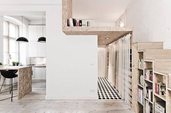 Pășind în cea mai mare cameră, lucrurile devin din ce în ce mai interesante. Facem cunoștință cu biblioteca în scări, realizată din așchiile de lemn, care creează în același timp calea de acces spre compartimentul suspendat de care aminteam mai sus. Este de mare impact felul în care materialele se suprapun, cum se susțin pentru a contura acest spațiu destinat ca zonă de depozitare, un al doilea dormitor ascuns, o altă bibliotecă la înălțime. Și pentru că inevitabil acum partea superioară a camerei reprezintă zona de maxim interes, nu poți să nu remarci detaliile clasice realizate din ipsos, precum și înălțimea camerei care avantajează spațiul, făcându-l mai încăpător decât este în realitate.